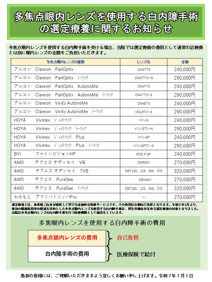 「多焦点眼内レンズ」は選定療養です。選択される場合は、3焦点・焦点深度拡張型から選ぶことができます。近年、新しいレンズの発売が続いております。多焦点眼内レンズの選択については、診察時にどういった見え方になりたいかを踏まえて相談しながら決めていきます。ご希望やご不安な点があれば診察の際に医師にお伝えください。